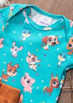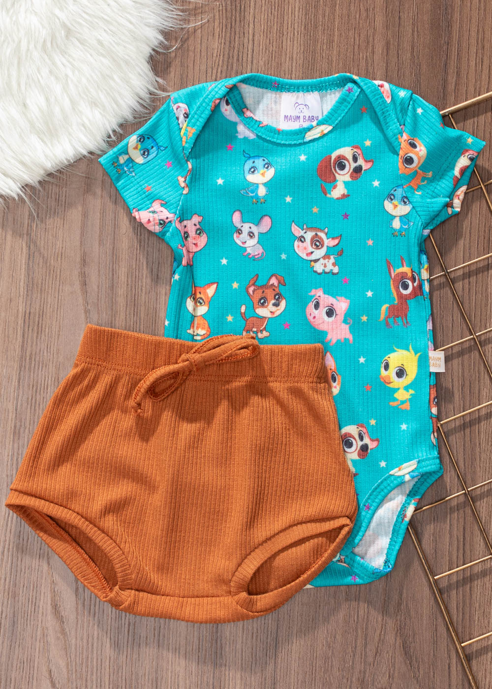 Conjunto Bebê Verão Body Animais e Tapa Fralda Marrom. O body é com estampa de animais e possui gola envelope que facilita na hora de vestir e o short é na cor marrom, possui elástico no cós e cordão falso. Um look confortável e lindo para seu baby.