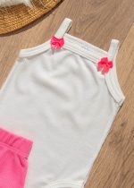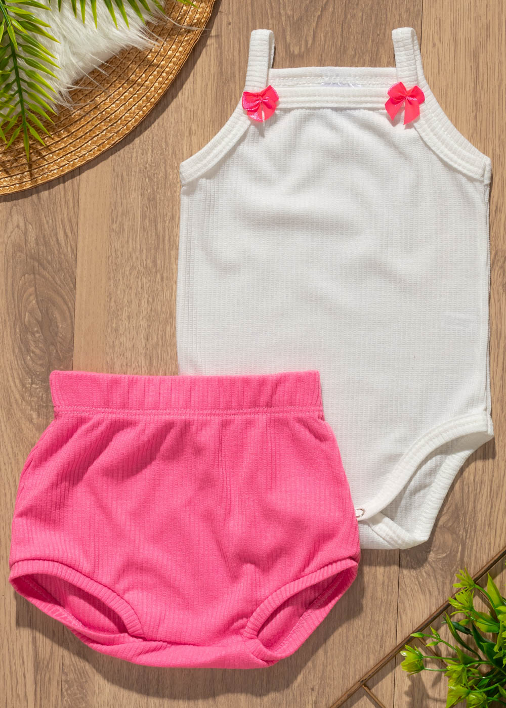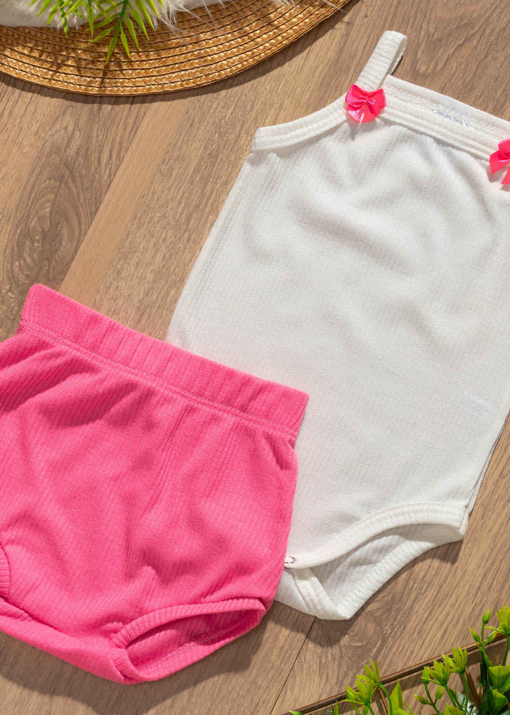 Conjunto Bebê Verão Body Branco com Laço e Tapa Fralda Rosa Barbie