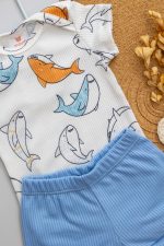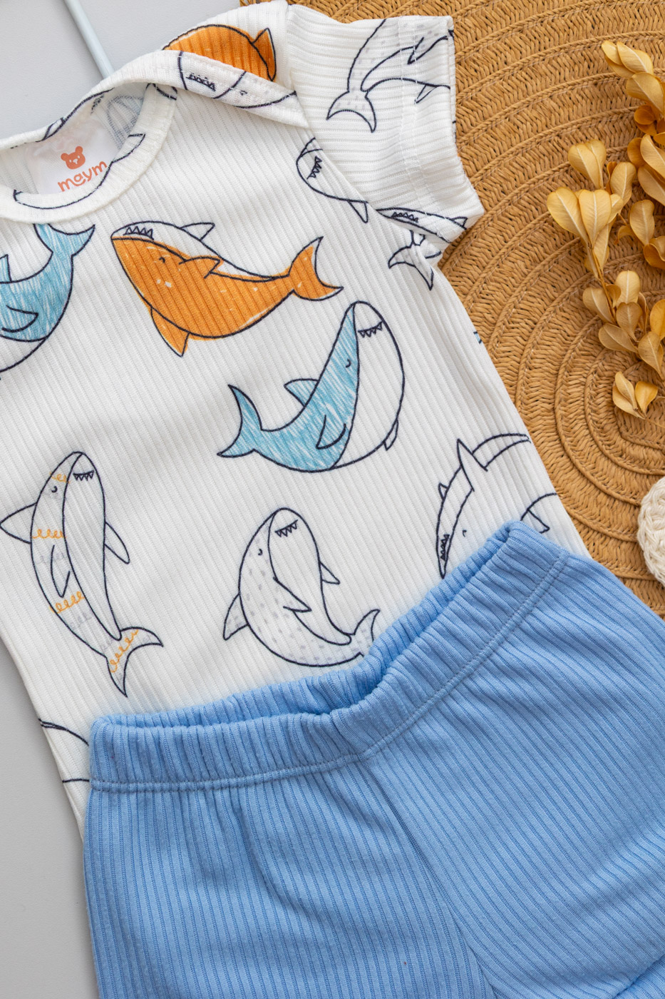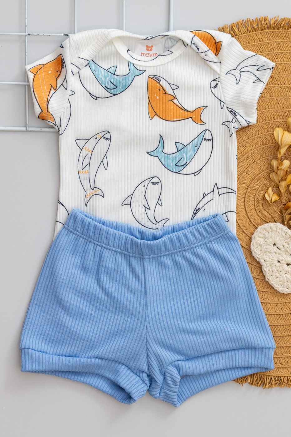 Conjunto Bebê Verão Body Tubarão e Tapa Fralda. O body é com estampa de tubarão e possui gola envelope que facilita na hora de vestir e o short é na cor azul bebê, possui elástico no cós e cordão falso. Um look confortável e lindo para seu baby.