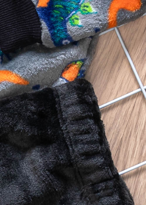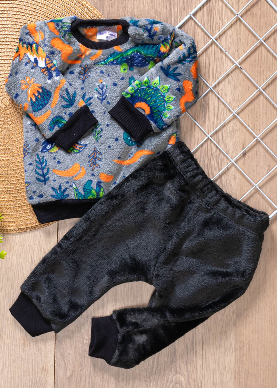 O Conjunto Bebê Inverno Masculino em tecido peluciado Fleece Cinza Dinossauros é super quentinho por dentro e por fora. Composto por uma Blusa estampada e uma Calça lisa, forma o look perfeito para os dias frios.