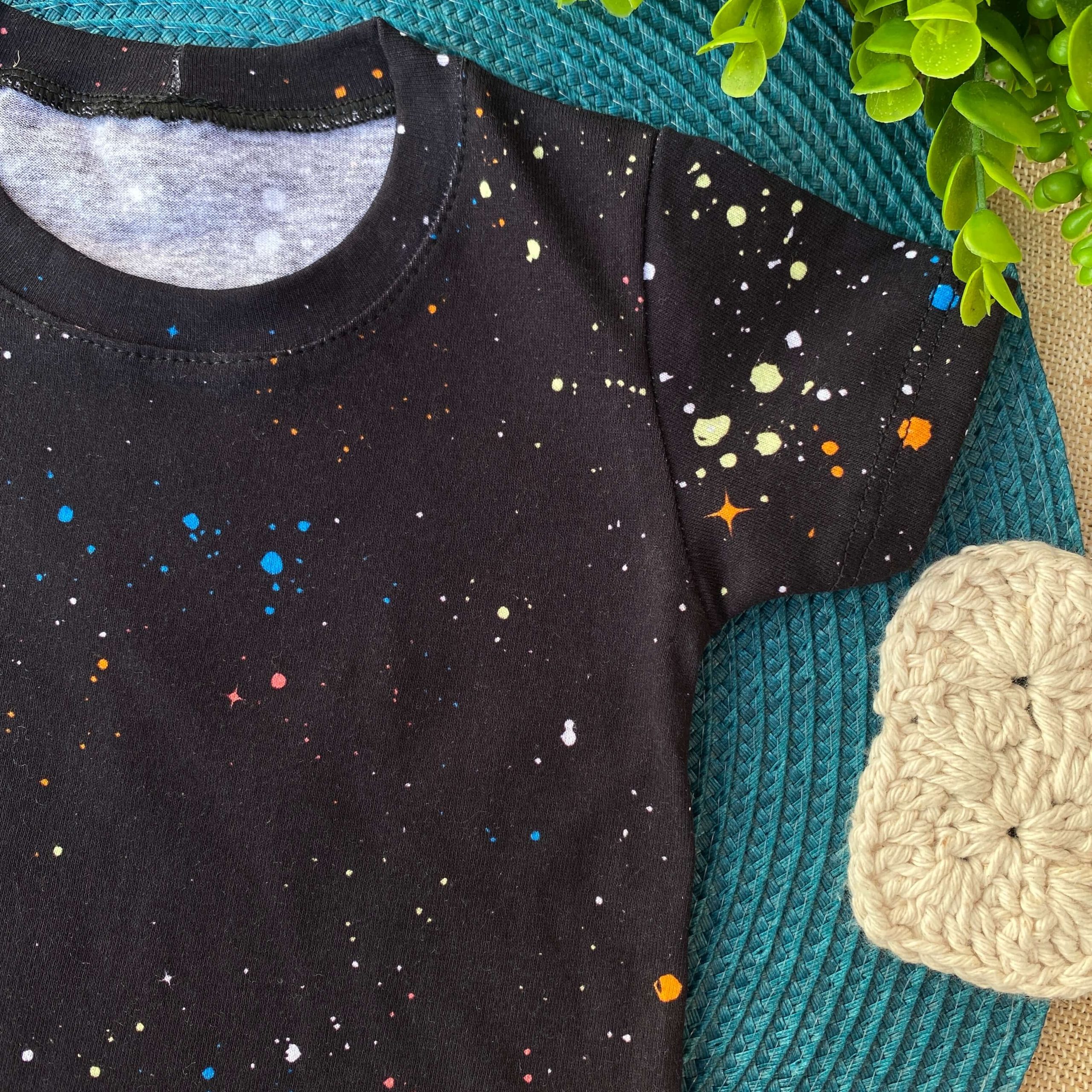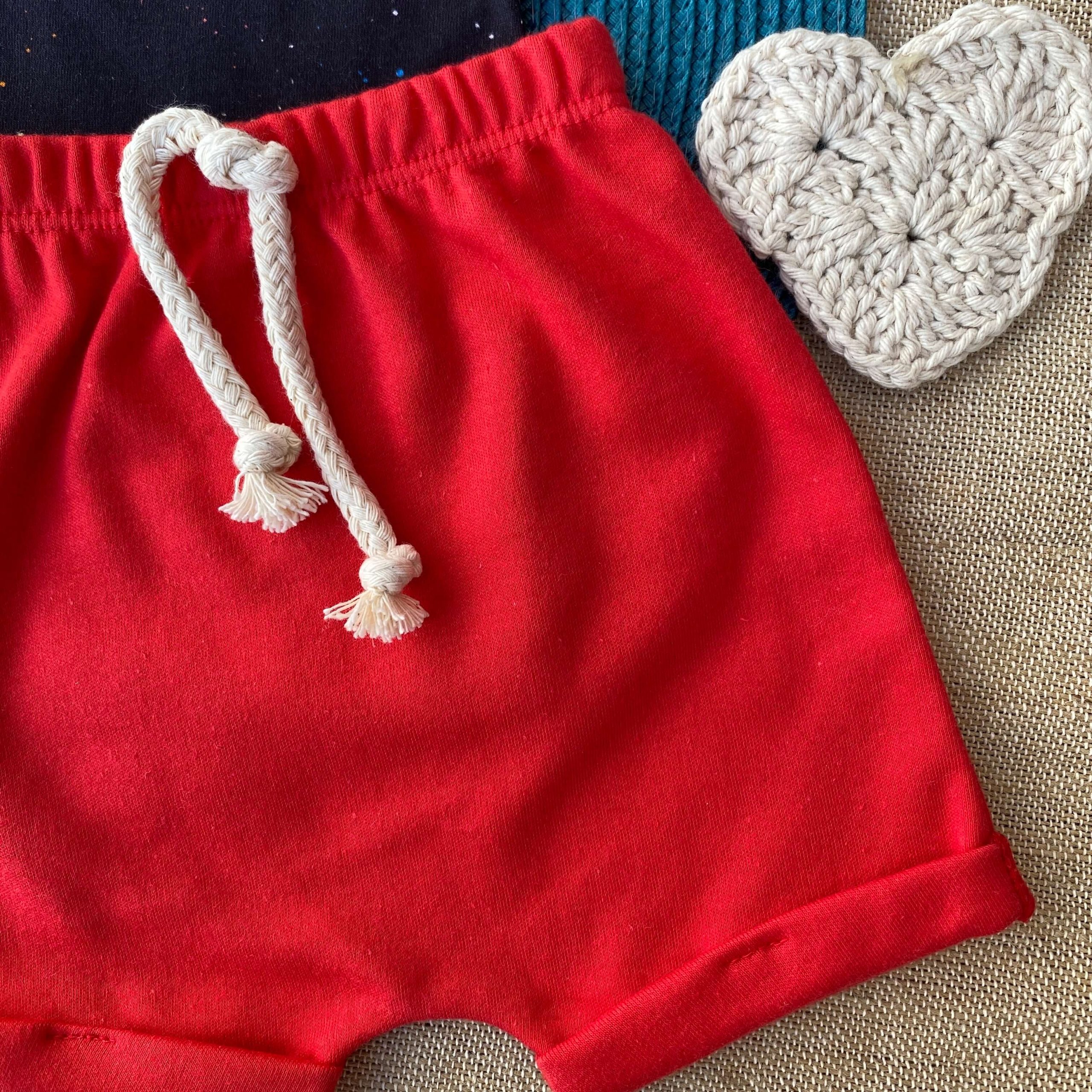 Conjunto Infantil Camiseta Galáxia e Bermuda Vermelha. A camiseta com estampa de galáxia é confeccionada em malha 100% algodão, com um toque suave e confortável, e a bermuda é confeccionada em malha com elástico e cordão falso de detalhe.