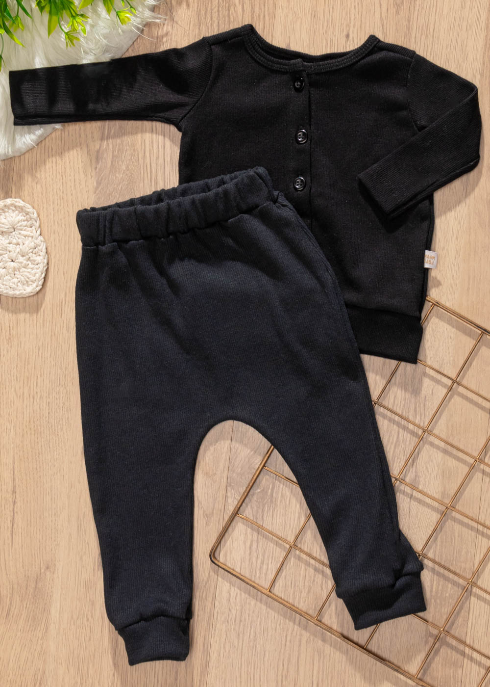 O Conjunto Infantil Casaco e Calça Preto é perfeito para usar no dia a dia, além de ser super confortável e lindo, o casaquinho contem botões que facilitam na hora de vestir os pequenos e fica lindo com qualquer look, e a calça saruel é super estilosa. Feitos em tecido Ribana, se encaixam perfeitamente no corpo.