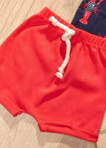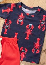 Conjunto Infantil Estampa Lagosta. A camiseta com estampa de lagosta é confeccionada em malha 100% algodão, com um toque suave e confortável, e a bermuda é confeccionada em malha com elástico e cordão falso de detalhe.
