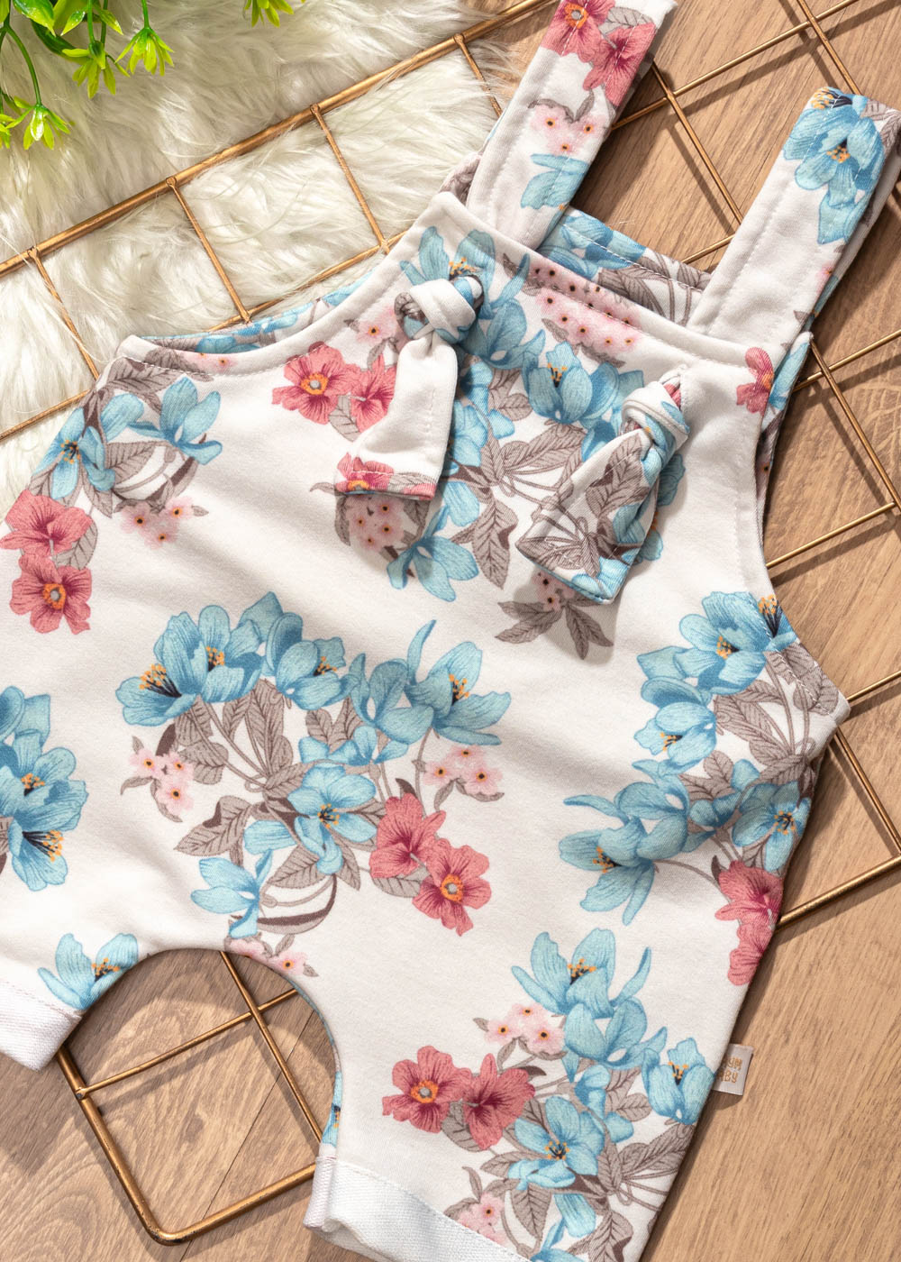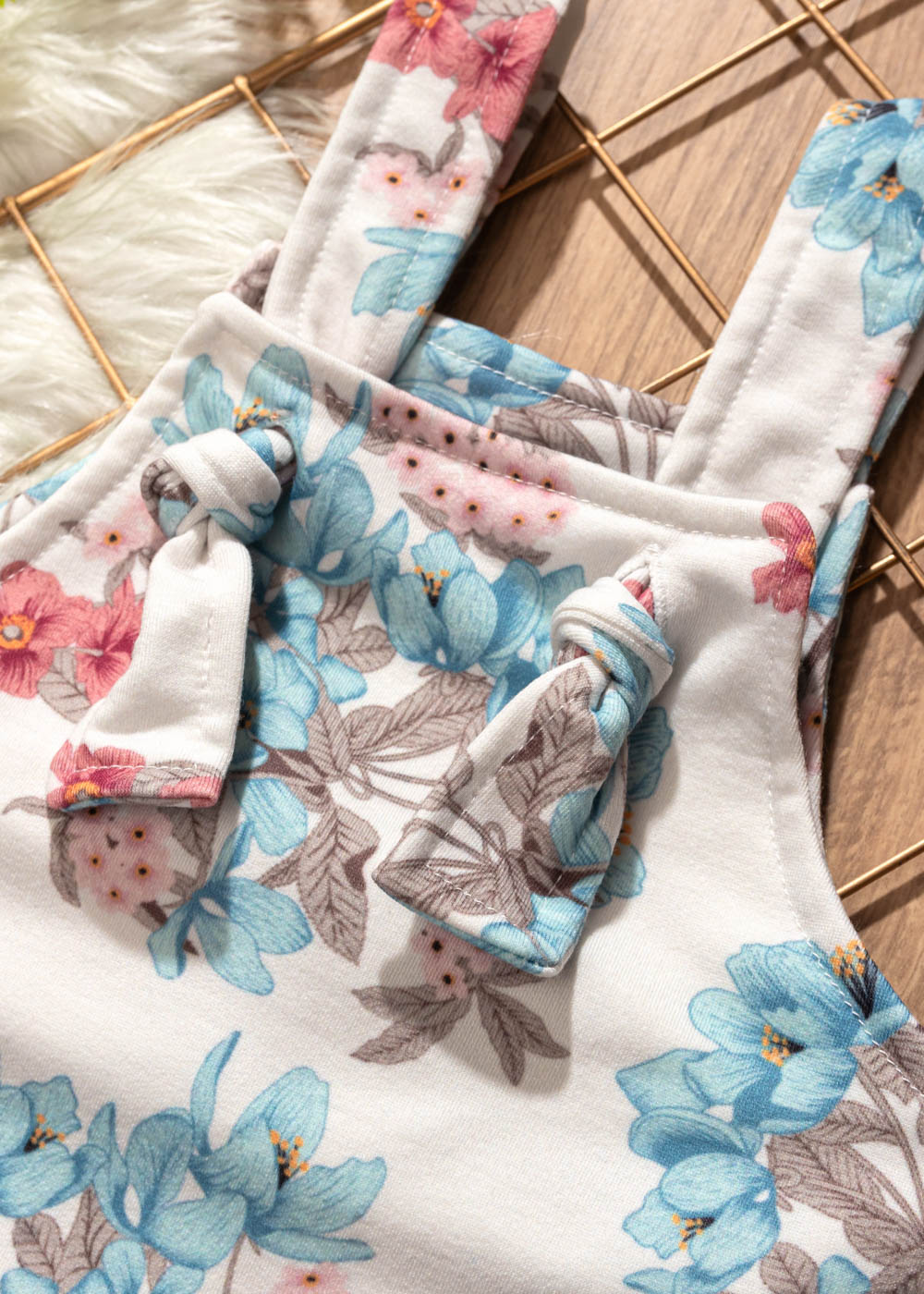A jardineira com estampa de flores possui duas alças para fazer o nó na frente, sendo assim uma peça com alça regulável. Ideal para usar nos passeios e dia a dia, seu baby confortável e estiloso.