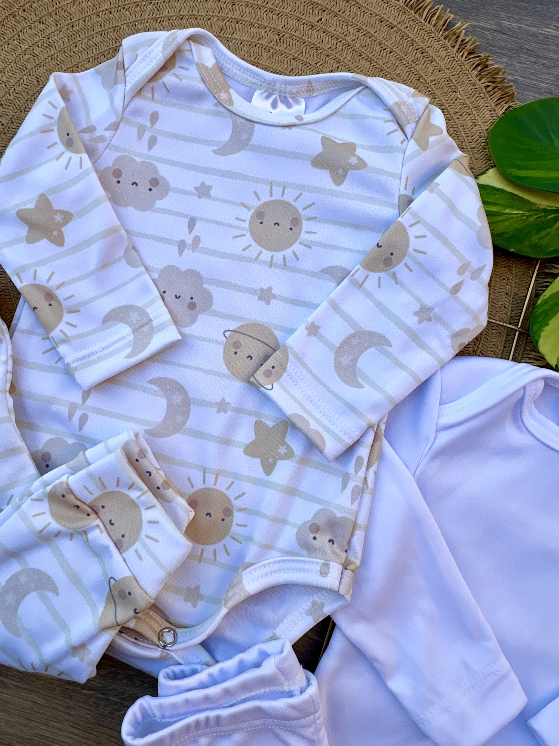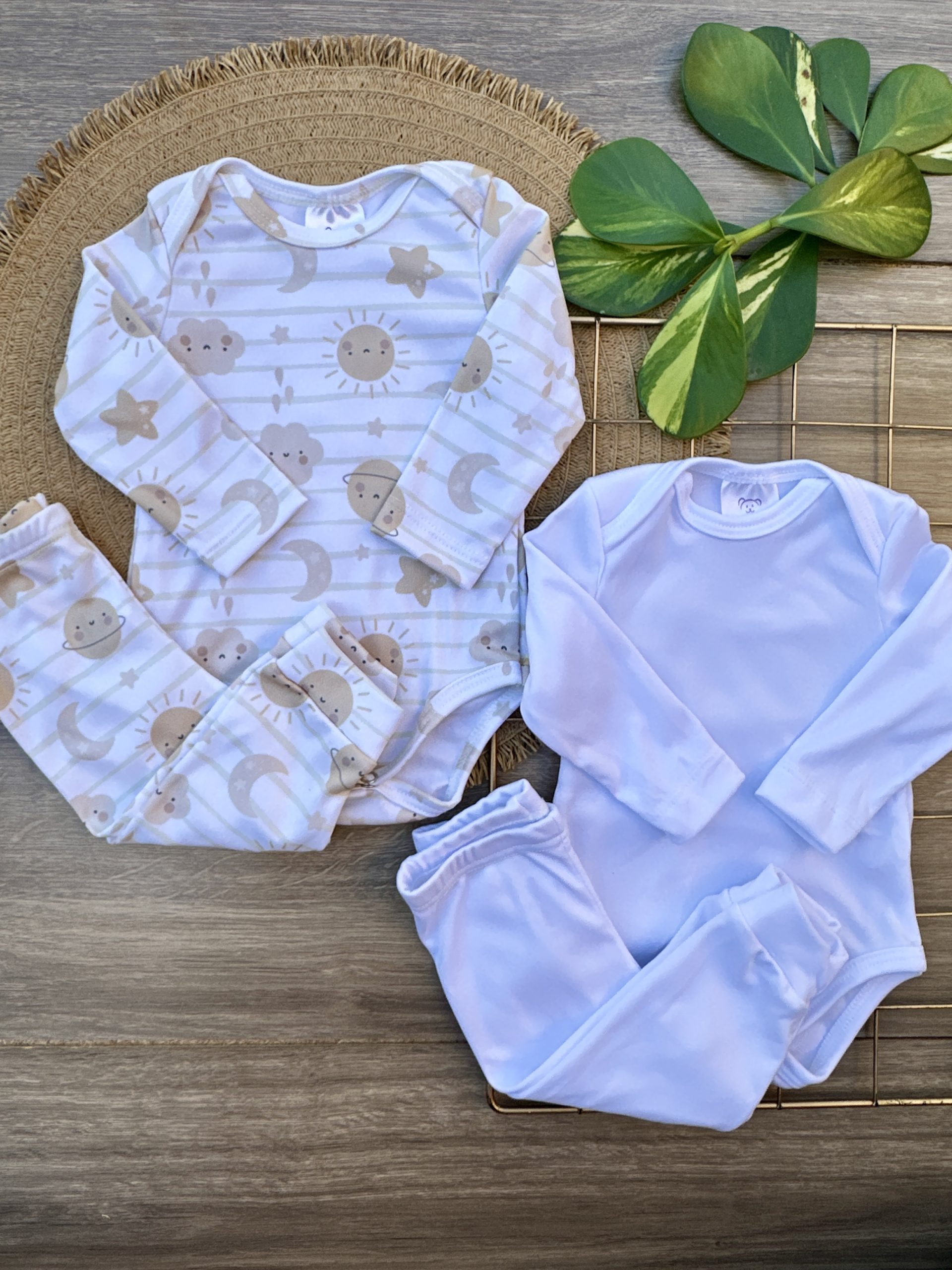 O Kit 2 Conjuntos Térmicos Bebê Pagão Longo Unissex Listras, é confeccionado no tecido termolight 100% poliéster, leve e confortável. O body tem gola envelope que facilita na hora de vestir. O kit compõe um conjunto estampado e outro liso.