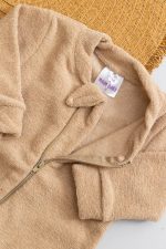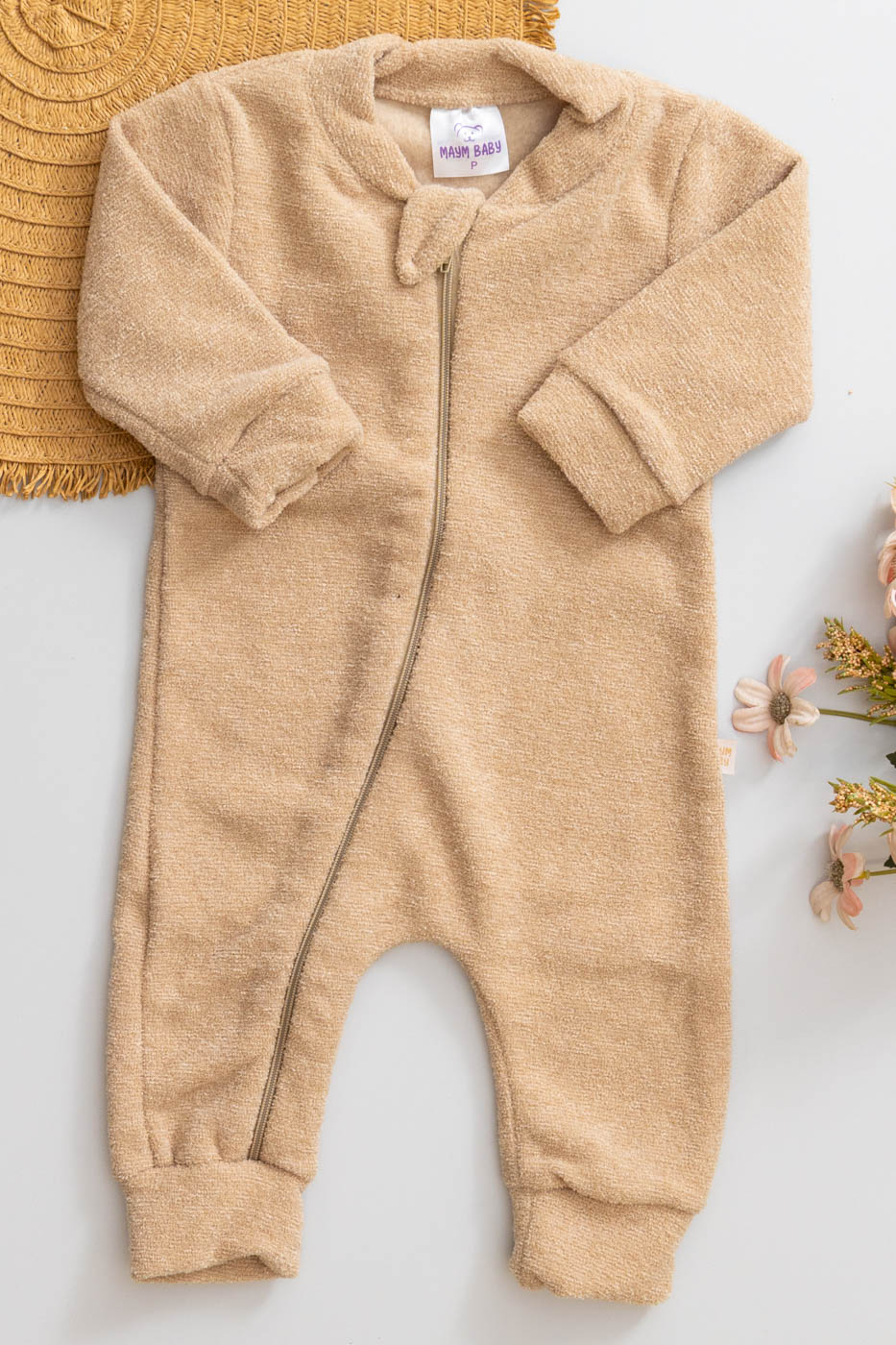 O Macacão Bebê Boucle Bege com zíper, super prático na hora de vestir, feito em tecido boucle, muito confortável, com o toque macio e super quentinho, a peça perfeita pra deixar sua baby ainda mais lindo. O macacão tem proteção interna no zíper.