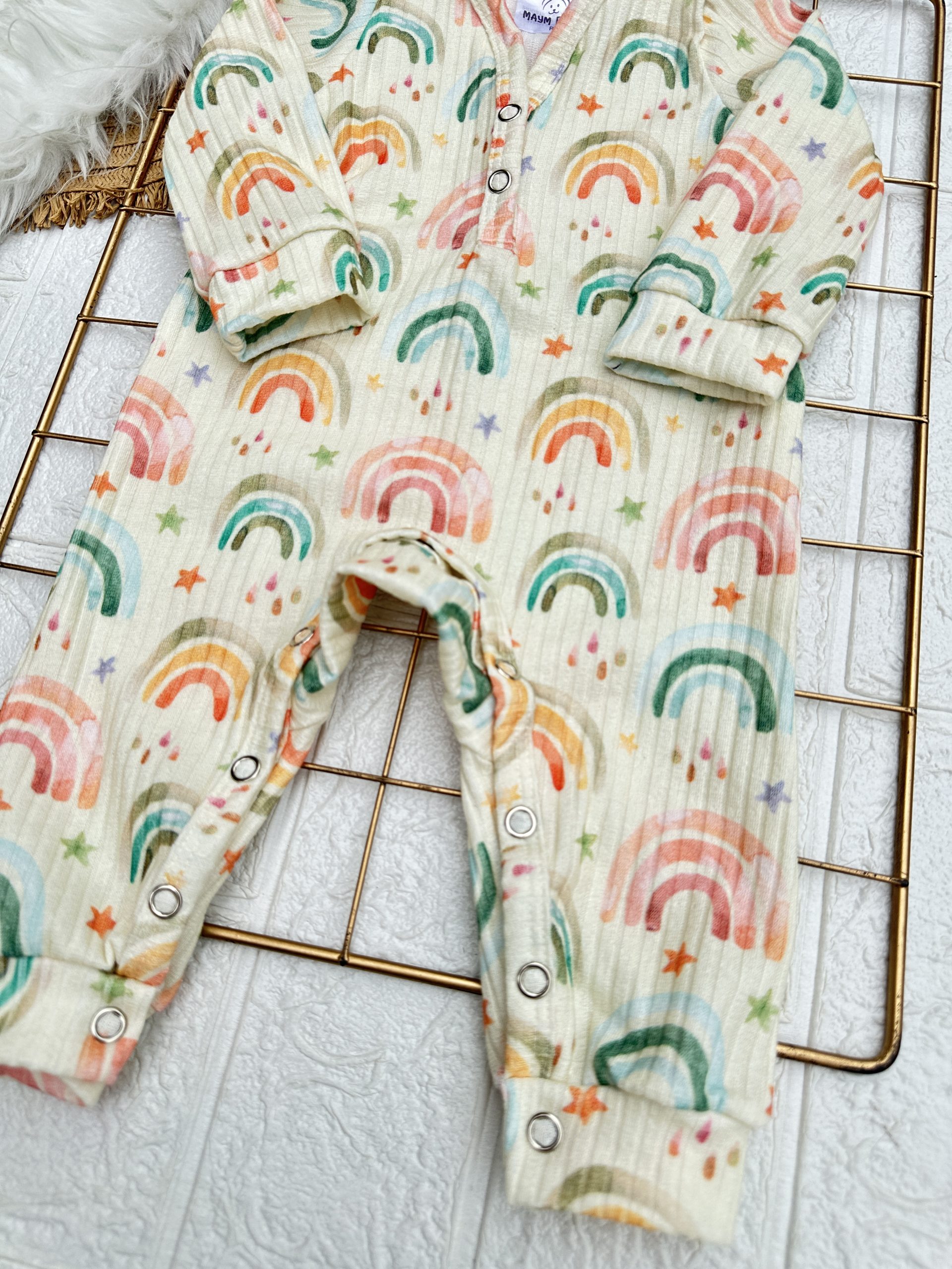 O Macacão Bebê Canelado Arco-íris é perfeito para o dia a dia do seu bebê, oferecendo conforto e estilo. Feito em tecido canelado macio, com estampa fofa de arco-íris e possui botão de pressão para facilitar as trocas. Um item essencial para o guarda-roupa da sua princesa!