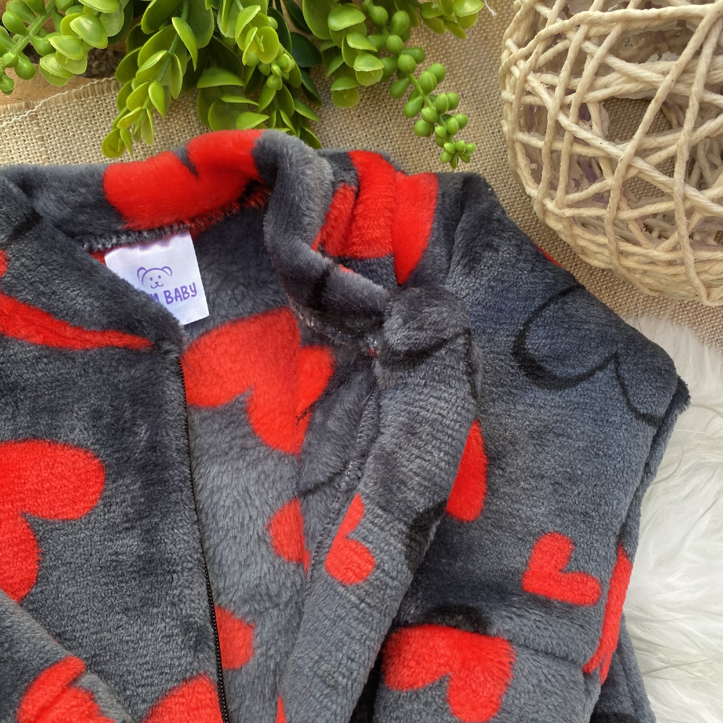 O Macacão Bebe Inverno em Fleece Chumbo Coração longo com zíper, é confeccionado em tecido super quentinho, todo peluciado por dentro e por fora. O zíper contem proteção interna para não ter contato com a pele do Bebê, é uma peça linda, confortável e indispensável para os dias Frios