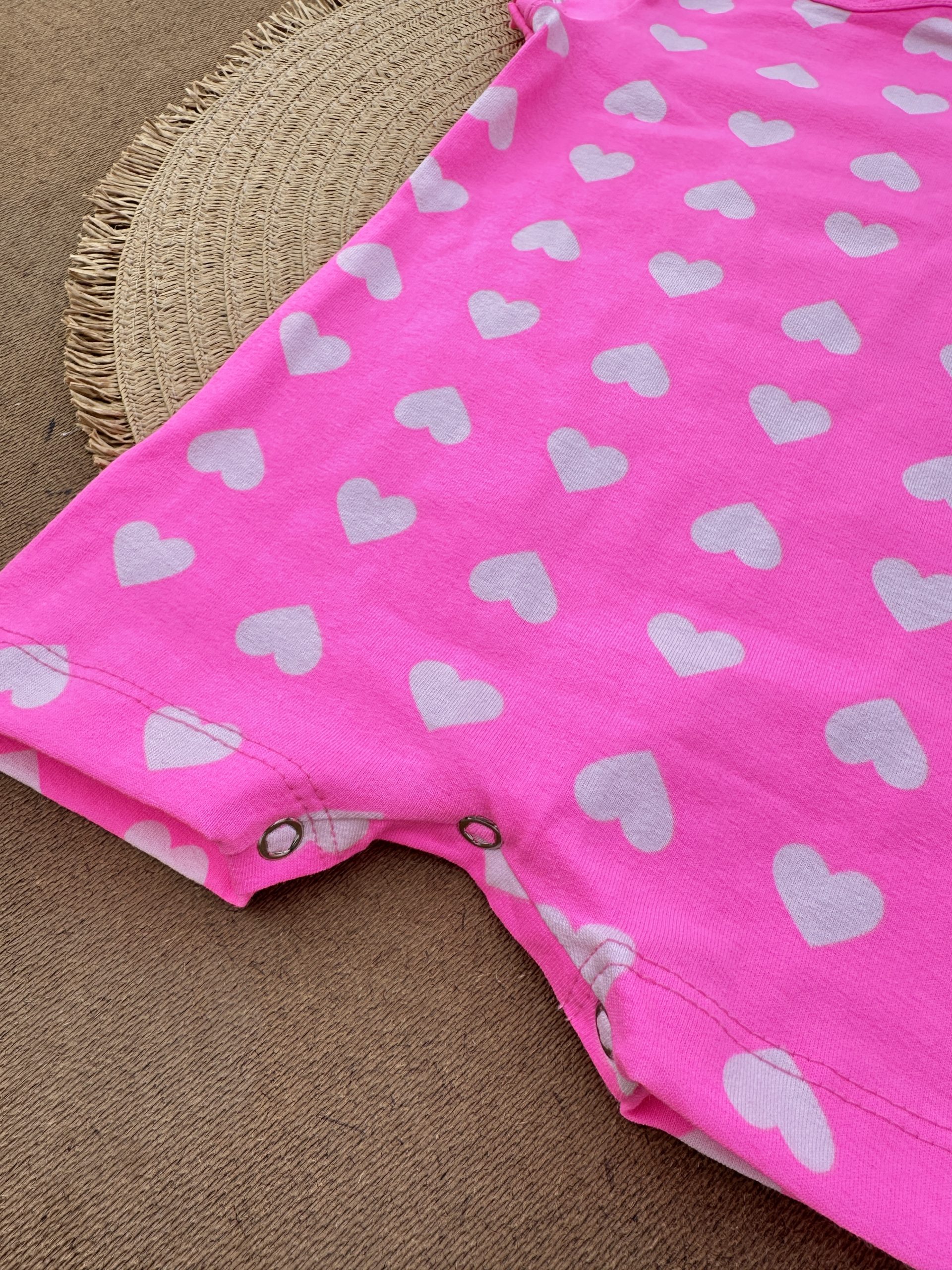 Macacão de Bebê curto, estampado de corações com toque super macio e confortável, possui botão de pressão para facilitar a troca. O modelo é fácil de vestir e prático para fazer a troca de fraldas. A peça ideal para qualquer ocasião. Sua princesa fresquinha nos dias mais quentes.